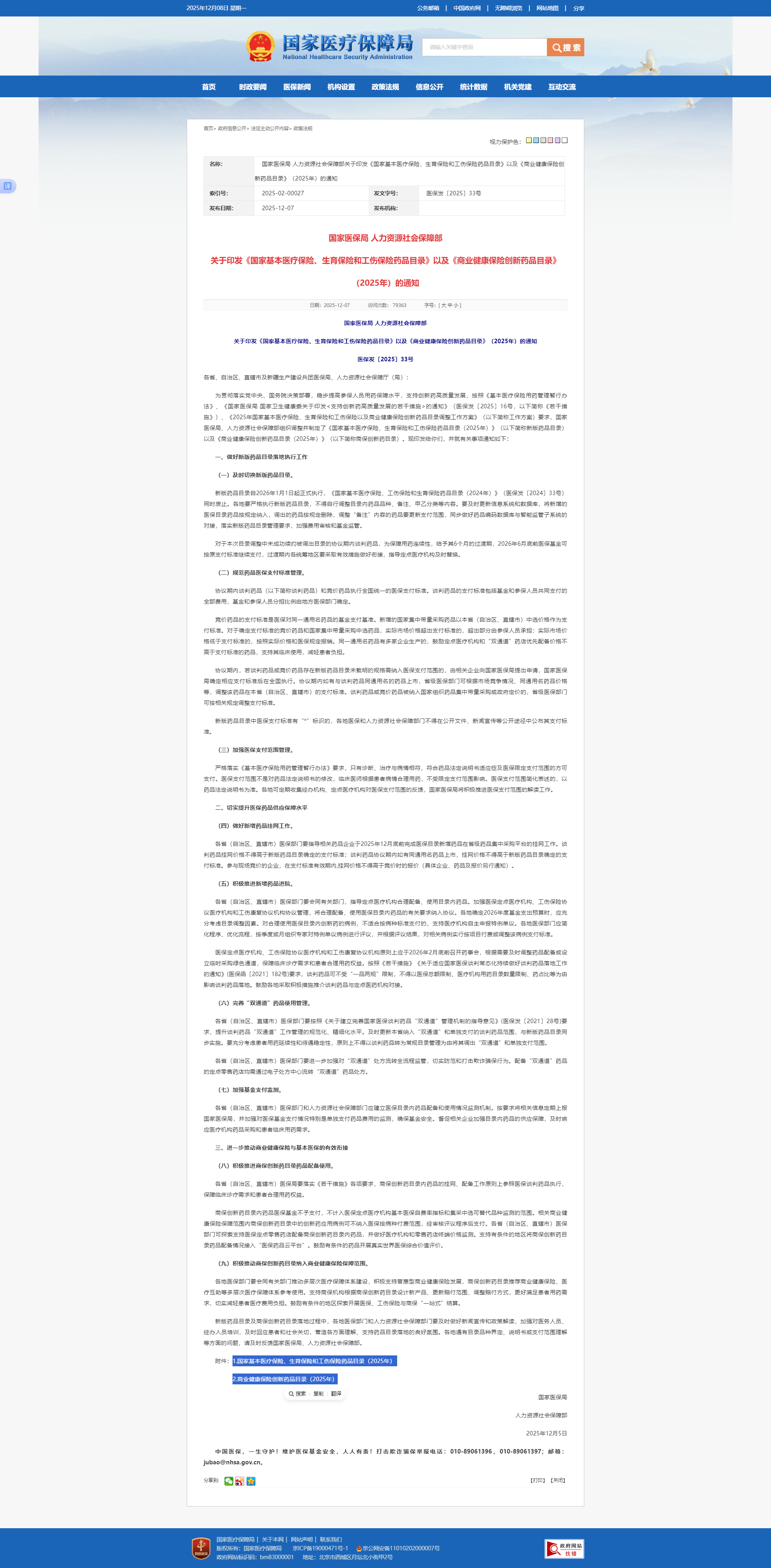国家医保局 人力资源社会保障部 关于印发《国家基本医疗保险、生育保险和工伤保险药品目录》以及《商业健康保险创新药品目录》(2025年)的通知